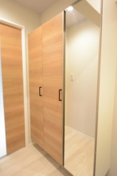 表扉の一部には縦長の鏡がついているのでお出かけ前の身だしなみチェックもサッと済ませられて便利。