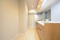 洗面室のお隣はキッチンスペース。リビング側から作業スペースが見えにくいので、急な来客があっても雑多なところを見られる心配はありません。また一番奥の見えずらいところに冷蔵庫置き場があります。