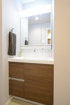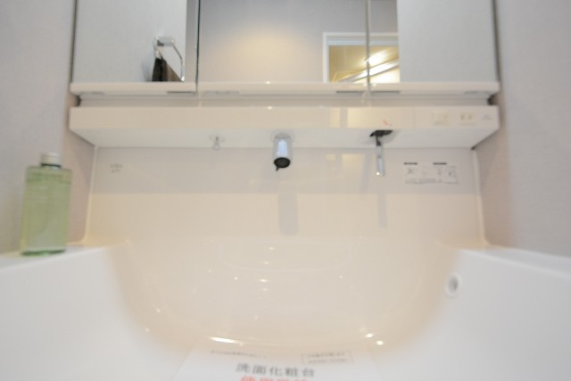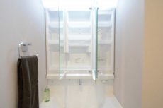 洗面台はシャンプードレッサータイプで三面鏡の裏など機能的。