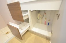 洗面ボウル下の空いているスペースを利用して洗面まわりで使う物やシャンプーのストックなどを保管しておくとよさそうです。
