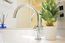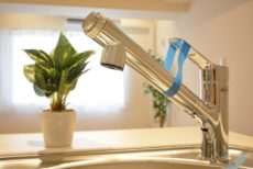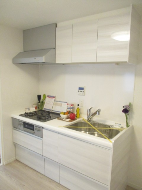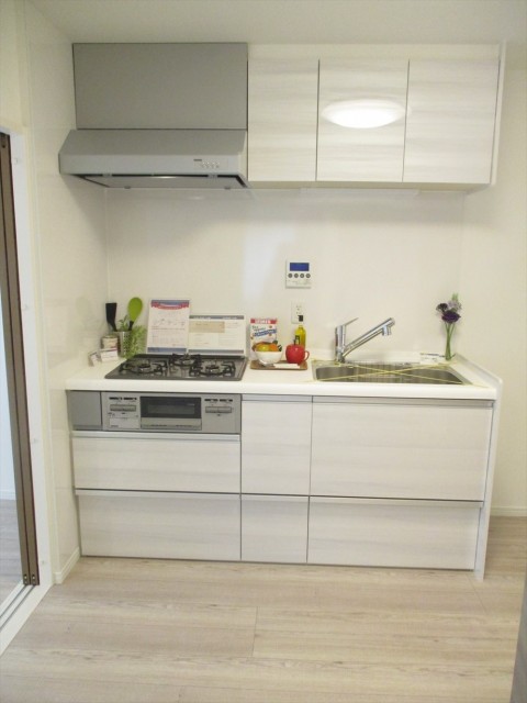 キッチンは壁付けタイプ。場所をとらずにお部屋を広く使えるのが特徴です。キッチン内が目立つのでなるべくキレイにしておきましょう。水栓は浄水機能付き。