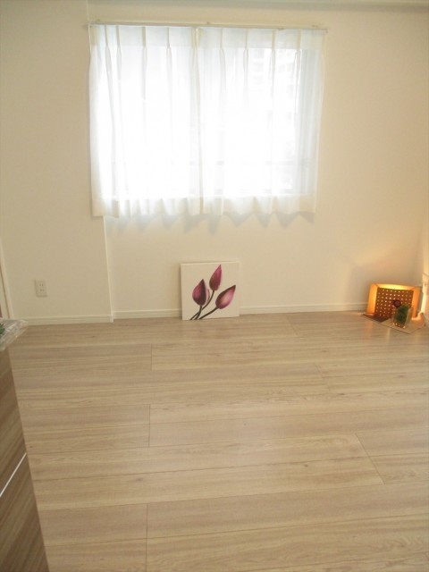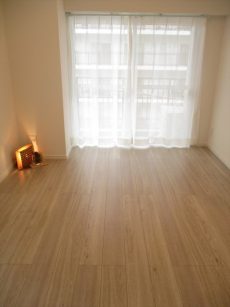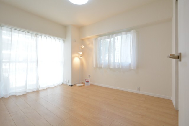 南東向きバルコニーに面した、ナチュラルカラーのフローリングと白のクロスを使用した明るい雰囲気のお部屋です。