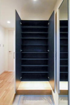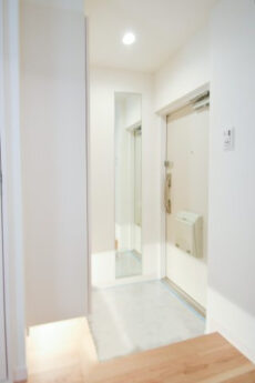 玄関入って正面のシューズボックスは収納力のあるトールタイプ。下が空いているので玄関が広く見えますよ。壁に貼られた姿見はお出かけ前に身だしなみをチェック出来て便利です。