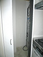 キッチン奥にある扉を開くと電気温水器があります。手前にはスペースのあるので上手に活用したいですね。
