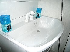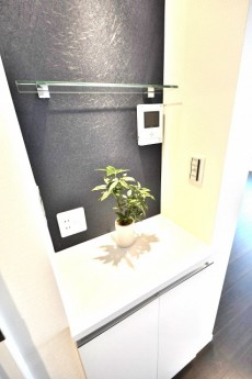 洗面台はコンパクトながら、シンクの両側がカウンターになっているので、朝のお出かけ準備がはかどります♪すりガラスの扉が付いている棚がありますので、スッキリお使い頂けます。