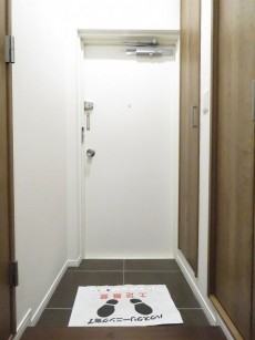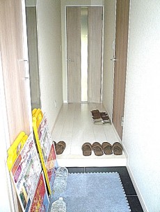 玄関扉をあけますと白を基調とした清潔感ある玄関ホールです。左手に玄関収納が設置されています。東南角部屋のポカポカなお部屋へ~