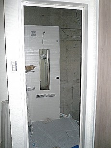 バスルームはグレーのパネルが清潔感を感じる110cm×160cmサイズ。