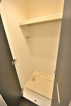 洗面化粧台は鏡の裏、引き出しと小物の収納スペースが豊富。カウンター部分が広めなので身支度もしやすそうです。洗濯機置場には扉がついているので使わない時は閉めておくと見た目もスッキリ。