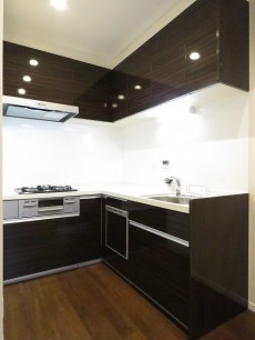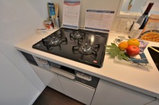 キッチンは作業スペースが広く使えるL字型。水栓は浄水機能付き、コンロは3口ガスコンロ、グリルに食洗機付きとスペック◎です。これだけ設備が揃っていれば後は腕をふるうのみ・・・!
