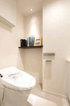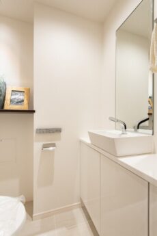 大きな鏡や収納が付いた、トイレ内にしては立派な手洗いが設置されています。もちろん「LIXIL製のトイレ」は洗浄便座付き。やっぱり、タンクレスはすっきりしてていいですね。