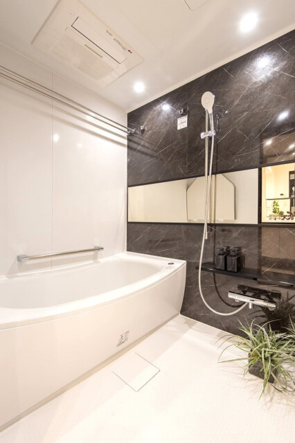 モノトーン調の落ち着いた雰囲気のバスルーム。浴室換気乾燥機能付き。