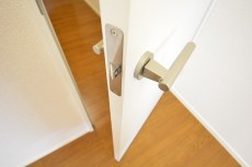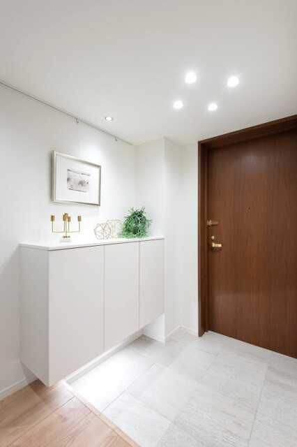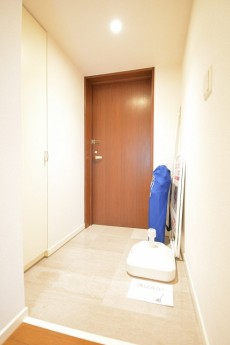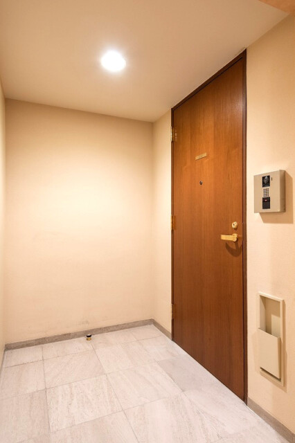 ホテルのような廊下を進むと玄関に到着です。落ち着いた木目の扉がいい感じですね。広めのアルコーブ内にはトランクルームもありますよ。