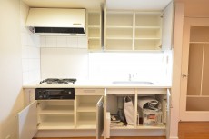上下に収納もたっぷり。3口コンロにグリルもついています。リビング内には窓がないのでお料理中はしっかり換気がポイントです。ビルトインコンロも新しく交換になる予定です。