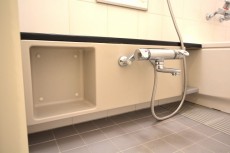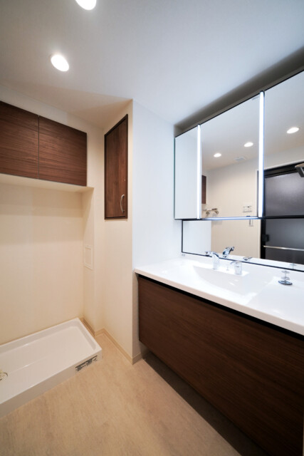 洗面室には洗面台と洗濯機スペース、浴室がまとまっていて、脱衣所もかねています。三面鏡付の洗面台は幅が広く、何人か一緒に使うことも出来そう。朝のラッシュ時には有難いですね。鏡の間に照明が付いているので影になることもありません。