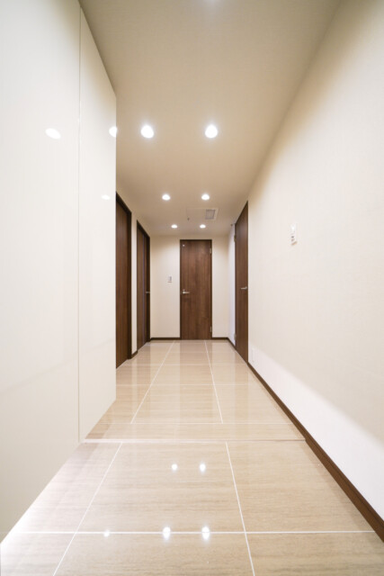 廊下はホテルライクな内廊下。落ち着いた雰囲気です。