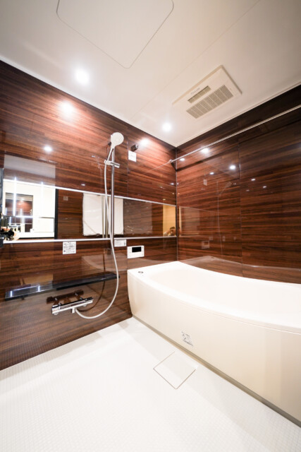 浴室はダークブラウンの鏡面仕上げパネルで高級感たっぷり。1418サイズのゆったりとした癒し空間で一日の疲れを洗い流しましょう!追い焚き機能はお風呂の準備もワンタッチ。そのまま保温してくれるので、ご家族でお風呂の時間が合わなくても温かいお風呂に入れますよ。雨が続く季節に嬉しい浴室換気乾燥機付き。