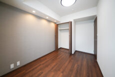 こちらは約8.4帖の洋室。リビング・ダイニングに隣接した、南東向きの窓のあるお部屋です。五角形という変わった形ですが、十分な広さがあるので使い勝手に問題はなさそうですね。間口の広いクローゼットも付いてメインベッドルームにぴったりです。