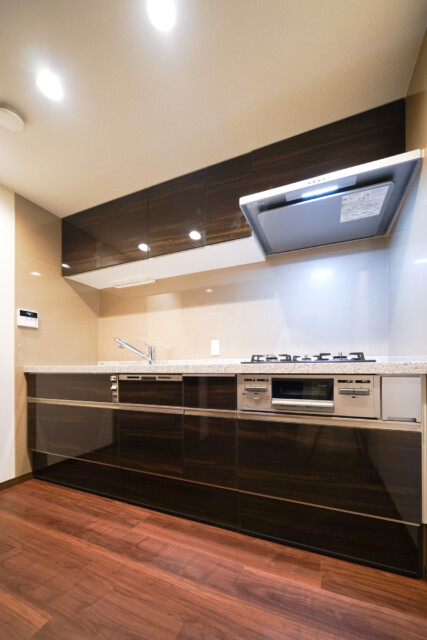 調理台下のスライドキャビネットに加えて吊り戸棚も設置され収納が豊富です。作業スペースもたっぷりなので、休日にご家族みんなでお料理なんて楽しそうですね♬ 食器洗浄乾燥機や浄水機能一体型水栓など家事をアシストしてくれる機能も充実していますよ。