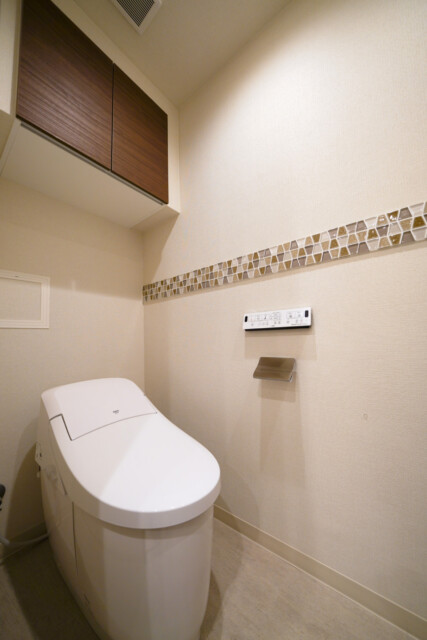タンクレスのトイレはINAX製洗浄機能一体型。トイレットペーパーのストックや、掃除道具を入れるのに便利な吊戸棚も付いています。アクセントのタイルがイイ感じですね。