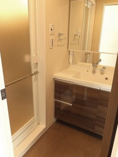 洗面台になります。大きなミラーはとてもみやすく、朝のメイクもバッチリですね。
