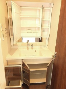 洗面下には引き出しがあり、棚付きの収納もあります。