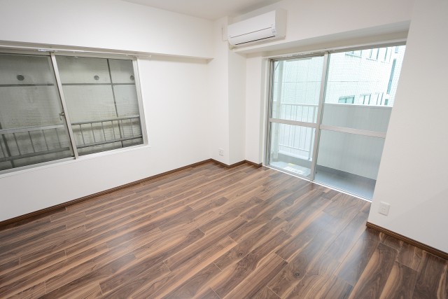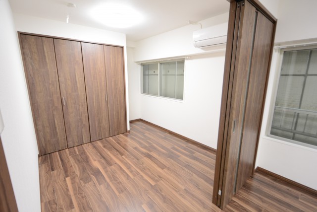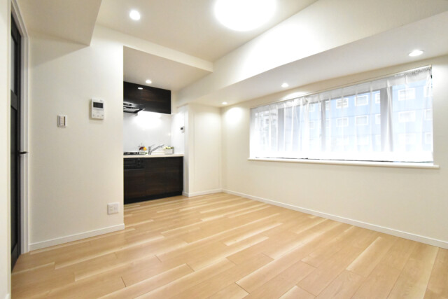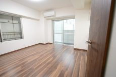 こちらは約4.8帖の洋室です。南側に窓があります。黒い枠の窓側はリビングダイニングとなっております。