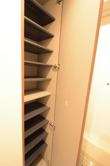 玄関をあがってすぐ右側にあるのはシューズBOX。トールサイズで収納力もバッチリです。 表扉の一部には縦長の鏡がついており、お出かけ前の身だしなみチェックもサッと済ませられます。