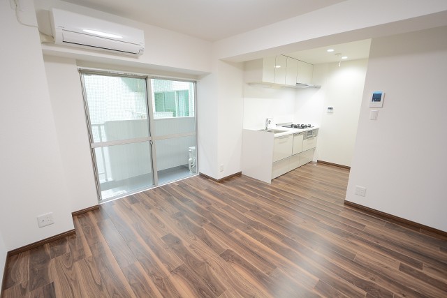 エアコン設置済みの約9.3帖のリビングダイニング。