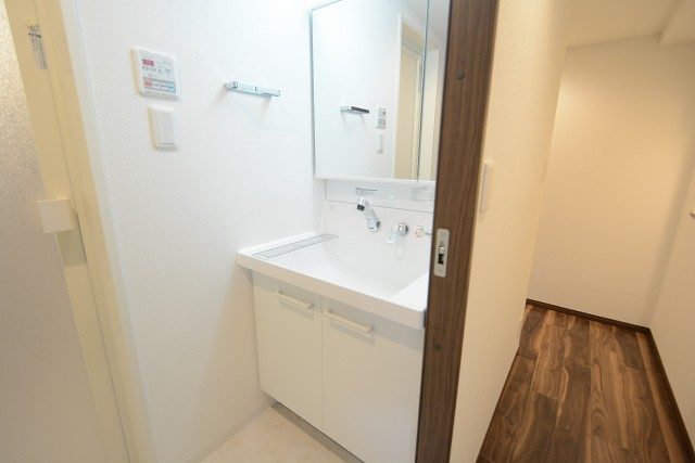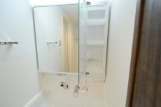 洗面化粧台は清潔感のある白。鏡の横には小物の収納に便利なキャビネットが設置されています。
