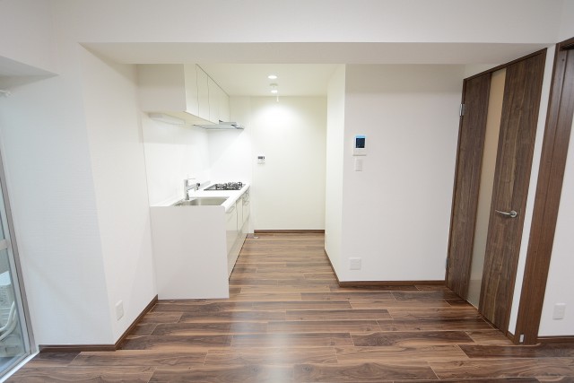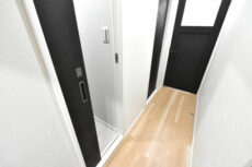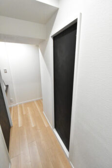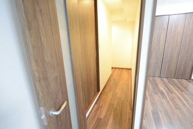廊下をさらに奥へ。右側の扉は洗面室、正面の扉はLDKです。