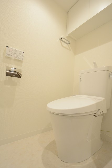 洗面化粧台の向かい側はトイレ。ウォシュレットとペーパーのストックを入れておくのに便利な吊戸棚が設置されています。