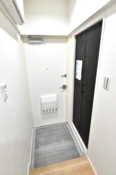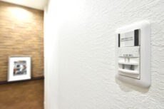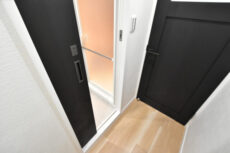 インターホンは来訪者の顔が確認できるTVモニターがついており、セキュリティ面も安心。玄関扉すぐ横の扉の中は電気温水器が入っています。