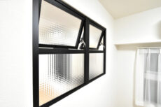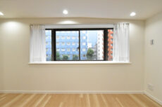 南側は隣の建物が近くこちら側の窓からの採光はあまり望めません。その代わり、LDKとつながった窓からLDKを通して外光を取り入れることができるようになっています。窓の外は15~20cmくらいでしょうか。開けておいてもどこからものぞかれることはありませんし、侵入の心配もなさそうです。隙間がないのも悪いことばかりではないんですね。