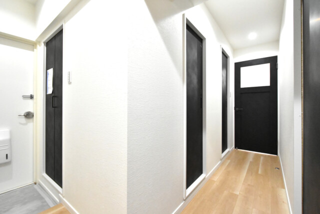 L字型に続く廊下を進んで行きます。黒の建具がオシャレ!!