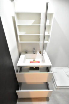 洗面化粧台の鏡裏、そしてキャビネット下は全て収納になっています。