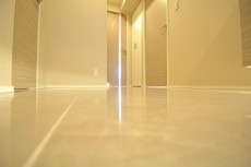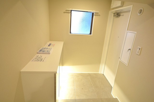 玄関は、石床に白基調でシューズボックスの下が光ります。