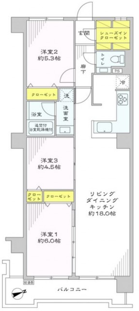 南向きバルコニーに面した明るいお部屋です。縦長でバルコニーに向かってキッチン、ダイニング、リビングと並べて使うオーソドックスなタイプ。家具のレイアウトもしやすそうです。