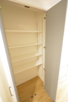 出てすぐの所には収納がありました。棚の高さが変えられるので、ある程度背の高い物も収納可能ですよ。