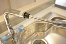 水栓は浄水機能付きシャワー水栓。ヘッドが伸びるので、大きな鍋を洗ったり、シンクのお掃除などにも便利ですよ。