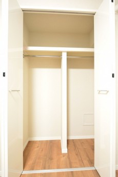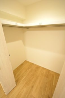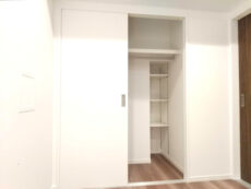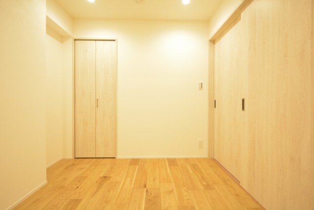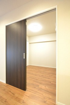 ダイニング横に位置する窓のないお部屋です。窓がないというとデメリットばかりが頭に浮かびますが、外からの音が伝わりづらく静かですし、光が入らないので眠るには絶好の環境!ゆっくり眠りたい方のベッドルームにお勧めです。棚が付いたクローゼット付き。