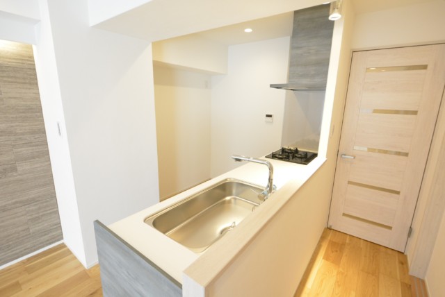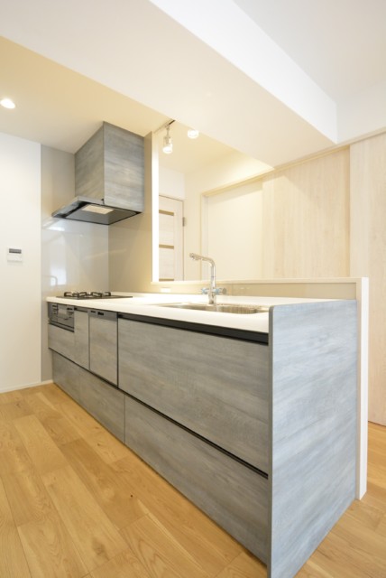 グレーの調理台。お部屋の中のアクセントにもなっています。