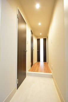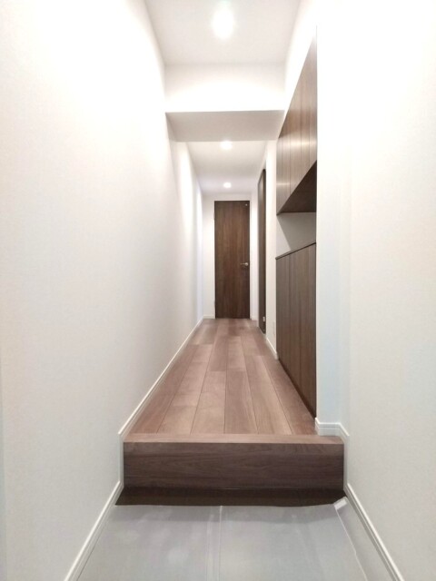 玄関から伸びる廊下はダークブラウンと白の落ち着いた雰囲気。最近は段差の小さな上り口も多いのですがこちらはしっかり高さがありますね。馴染みがあるからでしょうか、個人的にはこちらの方が好みです♪ 廊下部分に設置されたシューズボックスは収納力のあるトールタイプ。