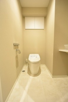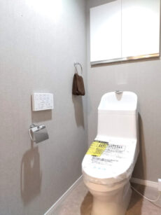 廊下突き当りのドアはトイレです。TOTO製の温水洗浄機能一体型。トイレットペーパーのストックや掃除道具を入れておくのに便利な吊戸棚も付いています。