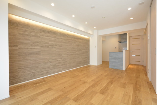 木目を生かしたナチュラルなフローリング。アクセントウォールは石のような質感で、間接照明に照らされていました。