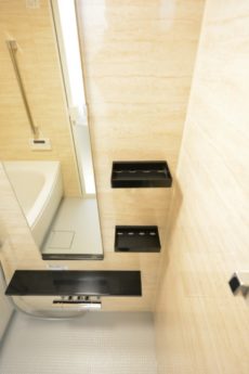 モノトーンでまとめられたスタイリッシュなユニットバス。追い焚き機能や浴室換気乾燥機など便利機能も充実しています。近頃はゲリラ豪雨など天気の急変が多いので、浴室乾燥機能は嬉しいですよね。
