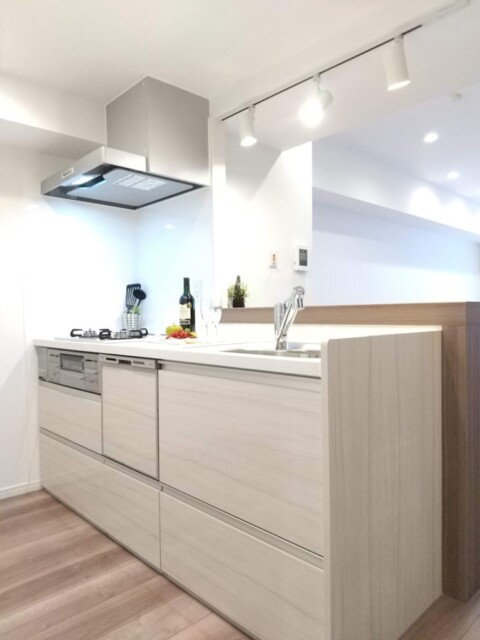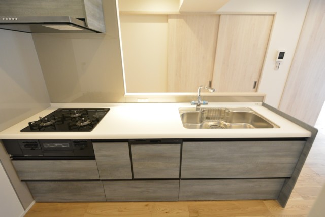 開放的でご家族とのコミュニケーションをとりやすいのが人気のキッチンです。コンロからの油跳ねを防ぐのに通常はパネルを張ったりするのですが、柱を上手く使っていますね。みんなの憧れ食器洗浄乾燥機付き!!!洗い物はお任せして、食後はのんびり過ごしましょう♪