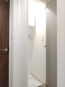 トイレと並んだ扉の奥には洗濯機スペース。こちらにも吊戸棚が付いているので、洗剤などのランドリーグッズを入れておけて便利ですよ。