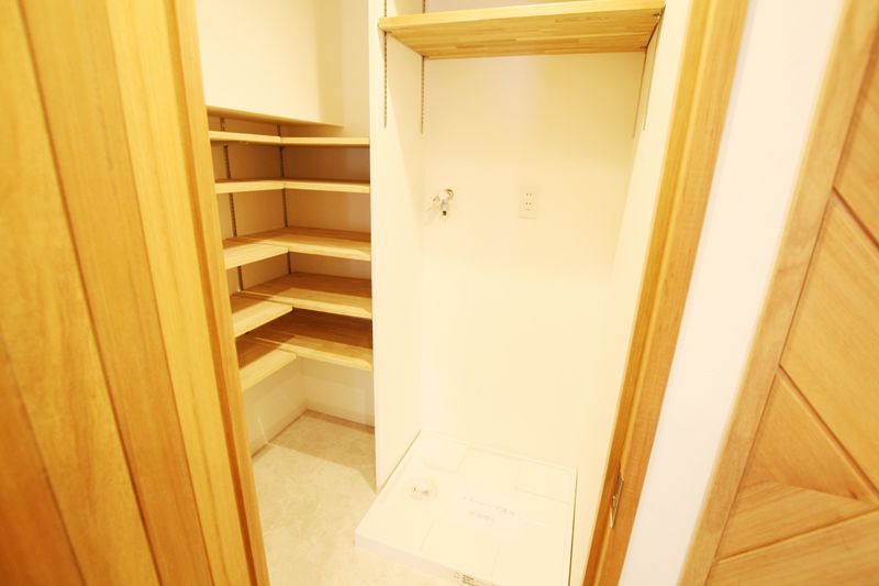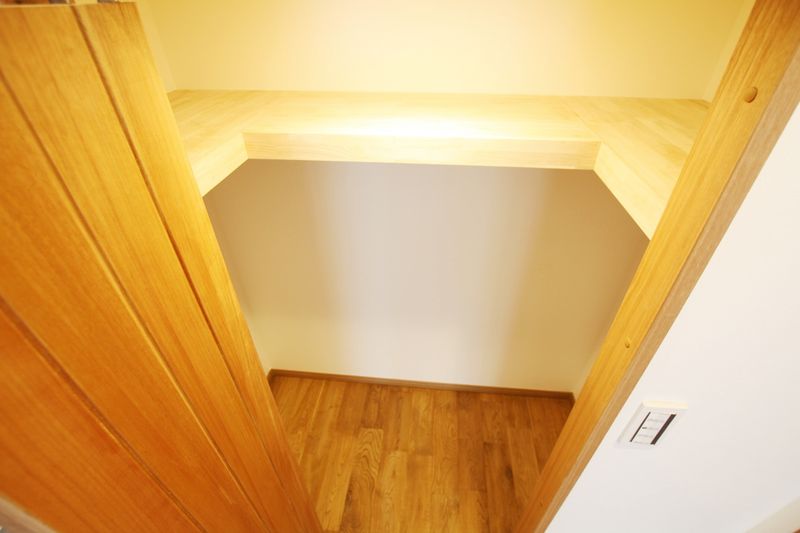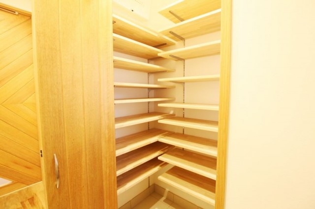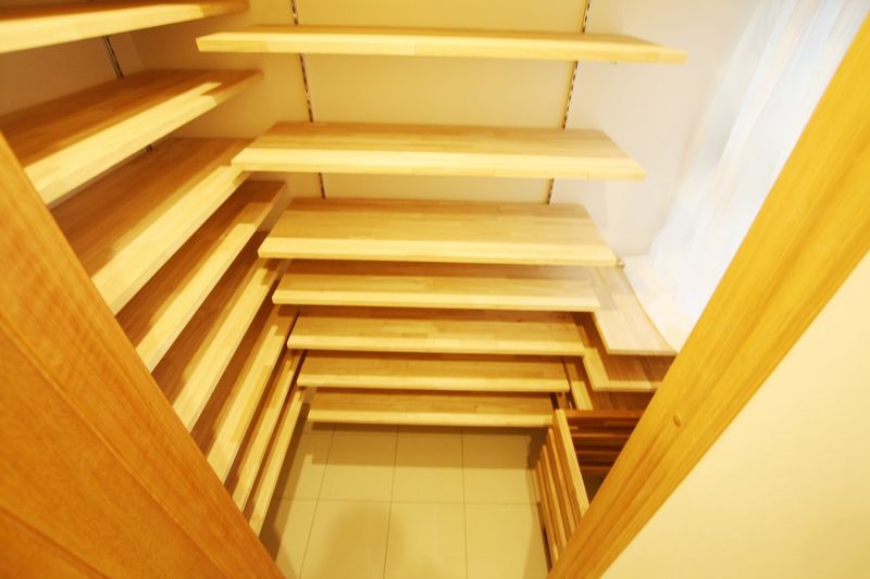 LDKへ入るとすぐ右側に可動棚の収納スペースがあり、日用品の収納や掃除機などもしまって置くことができそうです。