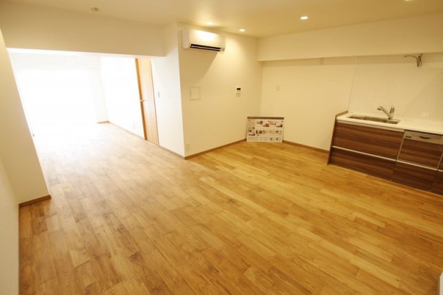 キッチンスペースは広く確保されていて、冷蔵庫以外にもキャビネットなども置けそうです。