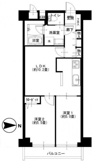 東向き、約48.30㎡の2LDK。振り分けタイプのお部屋です。